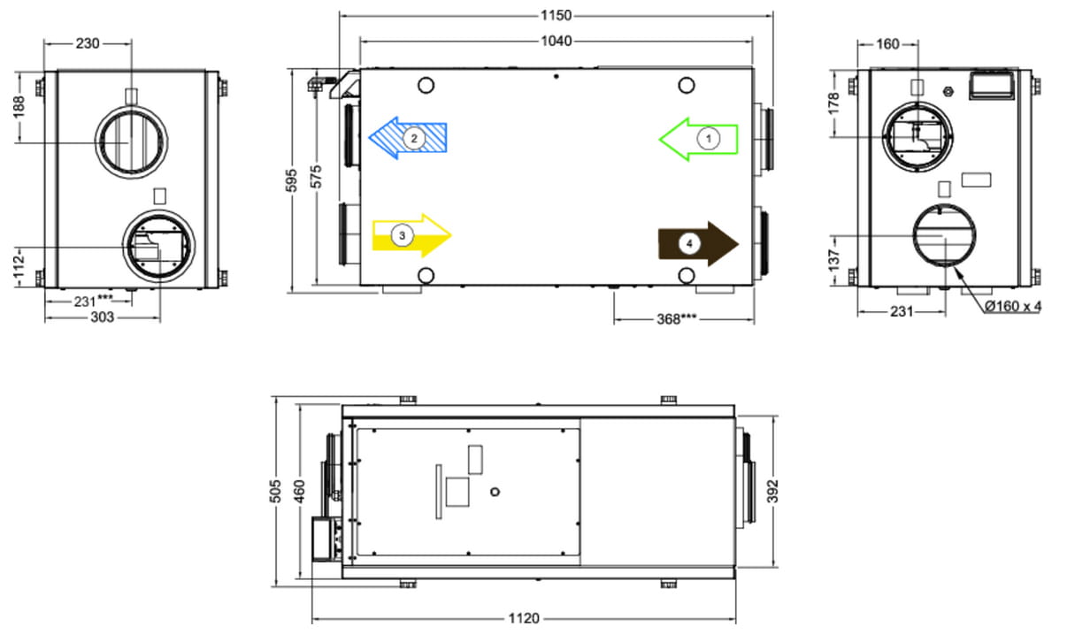 Centralę można zamontować w pozycji pionowej na podłodze (możliwe jest podłączenie zarówno lewo-, jak i prawostronne) lub poziomo na suficie (możliwe jest podłączenie zarówno lewo-, jak i prawostronne). Zestaw do montażu sufitowego jest dostępny jako akcesorium. Instalacja do góry nogami jest zabroniona.Zewnętrzna płytka przyłączeniowa z wstępnie okablowanymi wejściami i wyjściami umożliwia łatwą instalację i konfigurację zewnętrznych czujników, jak również zewnętrznych grzejników / chłodnic i innych akcesoriów. Skorzystaj z bezproblemowej instalacji i wykorzystaj moc dostosowywania.