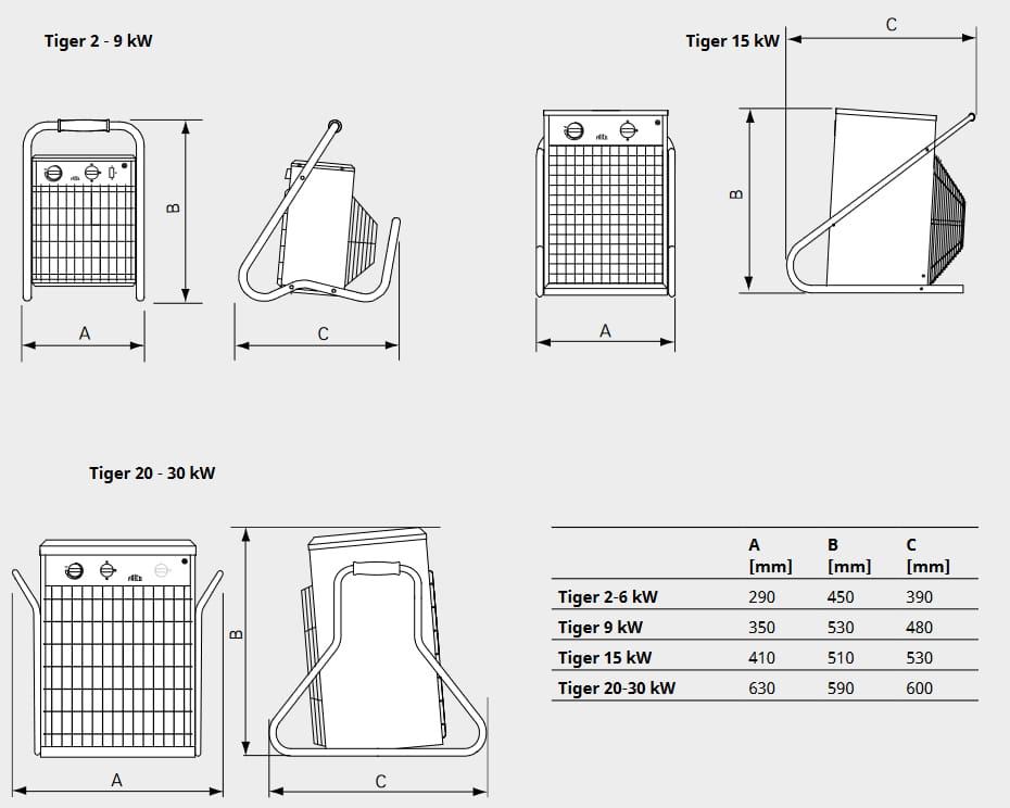 Tiger to seria solidnych i kompaktowych nagrzewnic. Tiger 2-9 kW są przeznaczone do ogrzewania i suszenia pomieszczeń takich jak garaże, warsztaty i sklepy. Tiger 15, 20 i 30 kW są idealne do ogrzewania i suszenia większych pomieszczeń, takich jak obiekty przemysłowe i warsztaty, gdzie wymagana jest większa moc. Nagrzewnice Frico są ciche i szybko zapewniają komfortowe ogrzewanie.