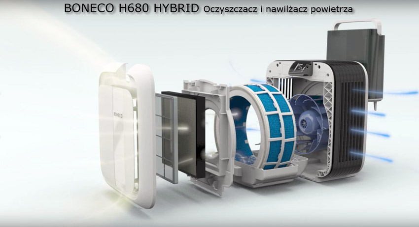 Ta Hybrydowa jednostka może być używana jako Nawilżacz, jako Oczyszczacz lub może jednocześnie łączyć w czasie pracy obydwie do funkcje. Głównymi elementami H680 są zintegrowany filtr HYBRYDOWY i mata ewaporacyjna. Stały filtr przedni zatrzymuje włosy, sierść zwierząt domowych, kurz i inne większe zanieczyszczenia. Znajdujący się za nim filtr HYBRYDOWY, zawierający filtr węglowy (węgiel aktywny) i filtr HEPA, filtruje niemal wszystkie wirusy, pyłki i absorbuje nieprzyjemne zapachy. Poza tym, mata ewaporacyjna jest odpowiedzialna za nawilżenie powietrza, którego obieg przez wodę dodatkowo jeszcze je oczyszcza.